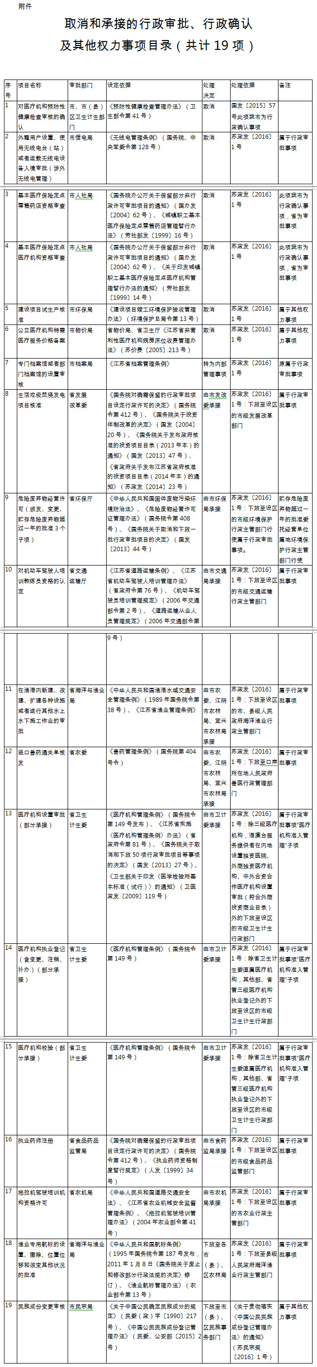 根據(jù)《國務(wù)院關(guān)于第一批取消62項中央指定地方實施行政審批事項的決定》(國發(fā)〔2015〕57號)、《省政府關(guān)于取消下放行政審批等權(quán)力事項和清理規(guī)范中介服務(wù)事項的通知》(蘇政發(fā)〔2016〕1號)等文件精神,市政府決定對應(yīng)取消和承接19項行政權(quán)力事項。其中,取消7項,市承接10項,各市(縣)、區(qū)承接2項。