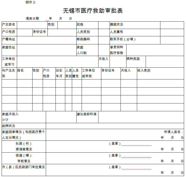 ?。ǘ┙值擂k事處(鎮(zhèn)人民政府)或者受委托的居民委員會(社區(qū)事務工作站)、村民委員會(社區(qū)服務中心)對申請人的個人疾病和家庭收入、財產(chǎn)狀況進行調查核實、民主評議,并在申請人所在居民委員會(社區(qū)事務工作站)、村民委員會(社區(qū)服務中心)公示7天。對無異議的,填寫《無錫市醫(yī)療救助審批表》(見附件二),上報市(縣)區(qū)民政部門審批。