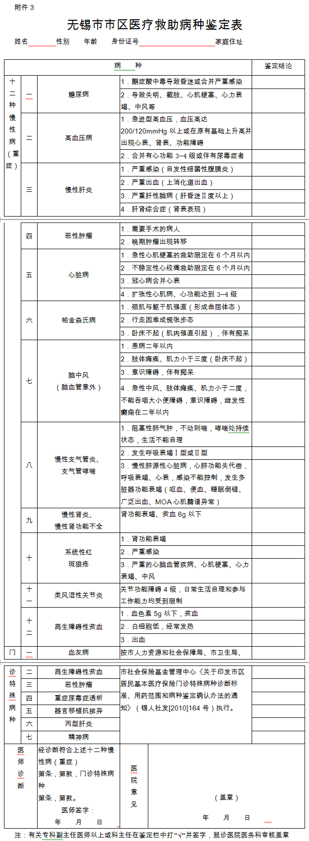 第十二條 醫(yī)療救助對象申請12種慢性?。ㄖ匕Y)或患有門診特殊病種救助標準的,須經(jīng)指定醫(yī)院(市區(qū)指定醫(yī)院為:市人民醫(yī)院、市二院、市三院、市四院、市中醫(yī)院、市傳染病院、一0一醫(yī)院、精衛(wèi)中心)有關??聘敝魅吾t(yī)師以上或科主任檢查、確診,并填寫《無錫市醫(yī)療救助病種鑒定表》(見附件三);由就診醫(yī)院醫(yī)務科審核蓋章后,到戶籍所在地社區(qū)(村)提出申請,再逐級上報縣級民政部門審批。