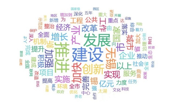 我們通過分析《政府工作報(bào)告》全篇的23397字,生成了詳細(xì)的關(guān)鍵詞統(tǒng)計(jì)表。在受監(jiān)測的151組關(guān)鍵詞中,詞頻最高的是“建設(shè)”(122次),最低的“削減”出現(xiàn)了6次。在剔除“無錫”“城市”“經(jīng)濟(jì)”等詞組后,詞頻和權(quán)重最高的十個(gè)關(guān)鍵詞分別是:建設(shè)、產(chǎn)業(yè)(產(chǎn)業(yè)強(qiáng)市)、創(chuàng)新、改革、增長、研發(fā)、環(huán)境、技術(shù)、工程、公共。