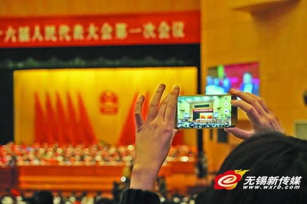 新媒體記者現(xiàn)場拍圖,“秒傳”后臺及時編發(fā),向市民傳遞大會盛況?!?方洲 攝)