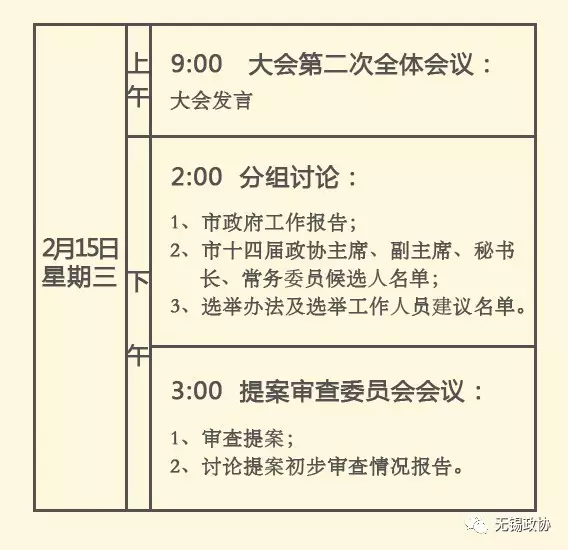 各代表團(tuán)分組審議(時間:9:00) 審議政府工作報告、“計劃”、“預(yù)算”報告及相關(guān)決議(草案); 審議《無錫市制定地方性法規(guī)條例(修訂草案)》; 醞釀、討論國家機(jī)關(guān)領(lǐng)導(dǎo)人候選人初步名單; 推選選舉工作人員; 聯(lián)合提名有關(guān)候選人。