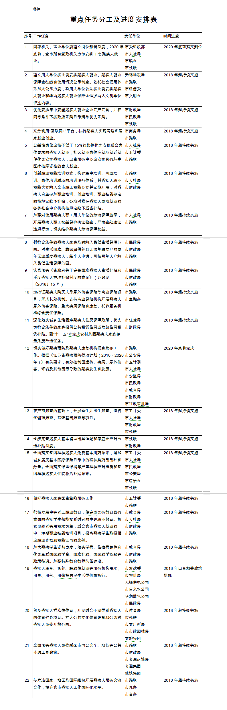 ?。ㄈ?qiáng)化權(quán)益保障機(jī)制。落實(shí)《無錫市殘疾人保護(hù)條例》,著力推動殘疾人就業(yè)、教育、殘疾預(yù)防和康復(fù)以及無障礙環(huán)境建設(shè)等法制化進(jìn)程,制定完善配套政策和標(biāo)準(zhǔn)體系。完善殘疾人權(quán)益保障機(jī)制,加強(qiáng)殘疾人法律救助、法律服務(wù)和法律援助,強(qiáng)化殘疾人維權(quán)服務(wù)。各地、各有關(guān)部門要落實(shí)好殘疾人工作主體責(zé)任,制定涉及殘疾人利益的重要政策要征詢殘疾人代表和殘疾人組織的意見和建議,維護(hù)殘疾人合法利益訴求。廣泛開展普法宣傳教育,形成保障殘疾人合法權(quán)益的良好社會氛圍。