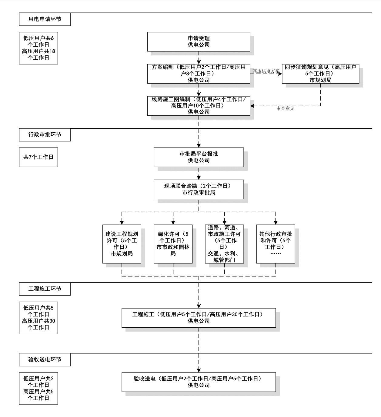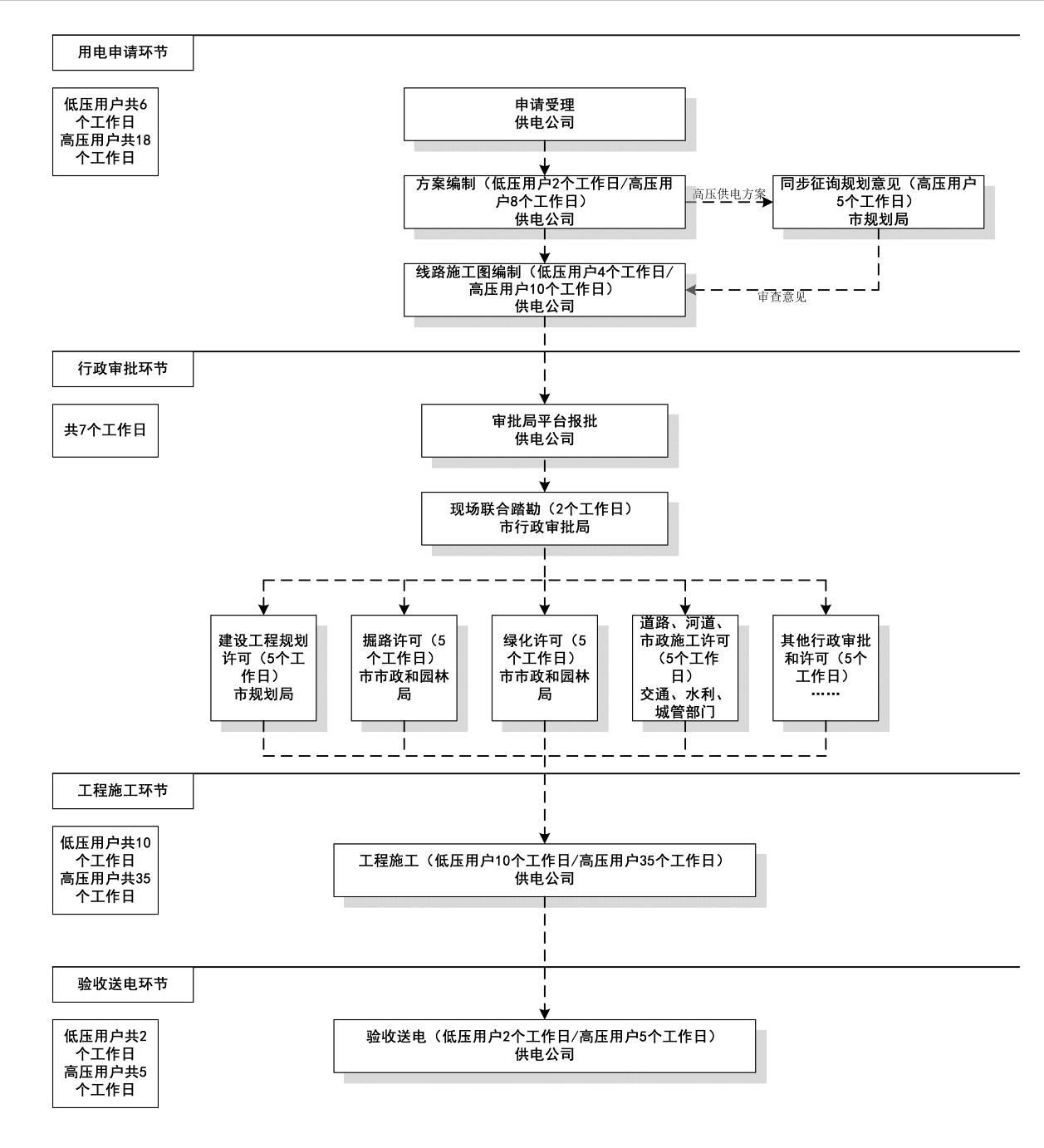 在用戶申請(qǐng)新裝、增容用電,由電網(wǎng)企業(yè)“一站式”受理的基礎(chǔ)上,各相關(guān)部門(單位)簡(jiǎn)化審批手續(xù)、優(yōu)化辦理流程、加強(qiáng)信息互通、深化“互聯(lián)網(wǎng)+政務(wù)服務(wù)”,共同搭建辦電“綠色通道”,將全市10(20)千伏高壓、400伏低壓非居民用戶平均辦電時(shí)間分別壓縮至60個(gè)和20個(gè)工作日以內(nèi)。其中,無(wú)外部線路工程(外部線路工程簡(jiǎn)稱外線工程)的,辦電時(shí)間原則上高壓項(xiàng)目不超過(guò)15個(gè)工作日,低壓項(xiàng)目不超過(guò)3個(gè)工作日;有外線工程但無(wú)需開挖的,辦電時(shí)間原則上高壓項(xiàng)目不超過(guò)60個(gè)工作日,低壓項(xiàng)目不超過(guò)20個(gè)工作日;有外線工程且需開挖的,辦電時(shí)間原則上高壓項(xiàng)目不超過(guò)65個(gè)工作日,低壓項(xiàng)目不超過(guò)25個(gè)(低壓)工作日。