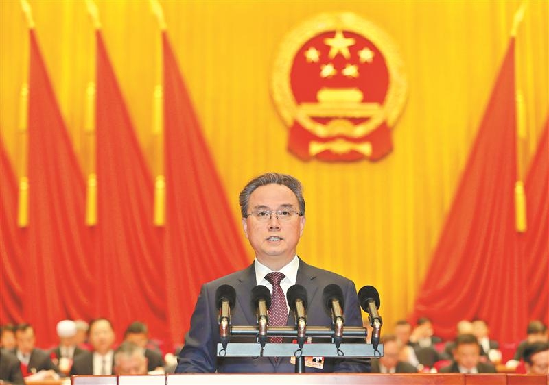 1月9日下午,無錫市十六屆人大四次會議第二次大會在市人民大會堂舉行。市人大常委會主任徐一平作市人大常委會工作報告。(呂楓 宦瑋 攝)