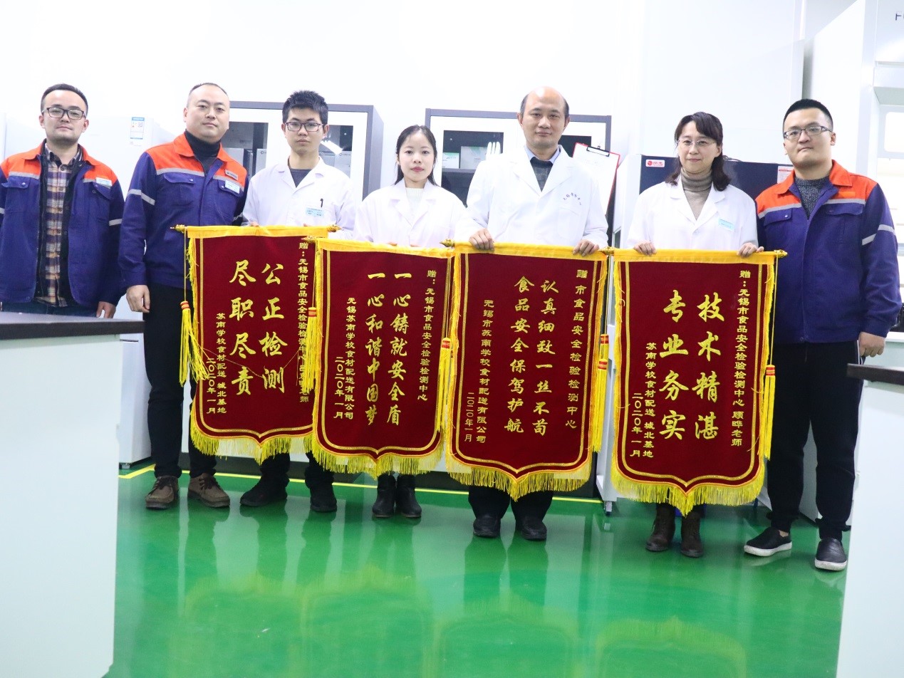 1月16日晚8點多,蘇南公司幾位負責同志帶著五面錦旗來到蘇南公司快檢實驗室,贈給市食檢中心以及中心駐點高級工程師顧曄、呂東明等同志,火紅的錦旗上金字的大字“一心鑄就安全盾,一心和諧中國夢”、“認真細致一絲不茍,食品安全保駕護航”。