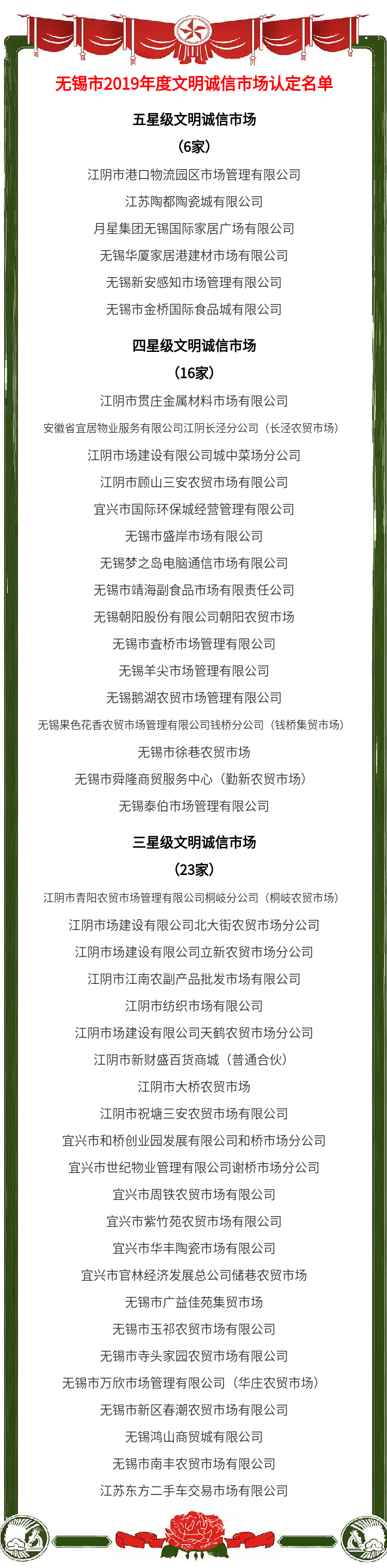 為促進(jìn)市場(chǎng)信用體系建設(shè),提升市場(chǎng)建設(shè)與管理綜合水平,營(yíng)造良好市場(chǎng)環(huán)境,由市市場(chǎng)監(jiān)管局、市文明辦、市委政法委等部門(mén)組成的無(wú)錫市文明誠(chéng)信市場(chǎng)評(píng)審委員會(huì)對(duì)2019年度文明誠(chéng)信市場(chǎng)組織了評(píng)定。經(jīng)過(guò)申報(bào)、復(fù)核、公示等程序,評(píng)審委辦公室對(duì)外公布,無(wú)錫市金橋國(guó)際食品城有限公司等45家市場(chǎng),被認(rèn)定為星級(jí)文明誠(chéng)信市場(chǎng)。