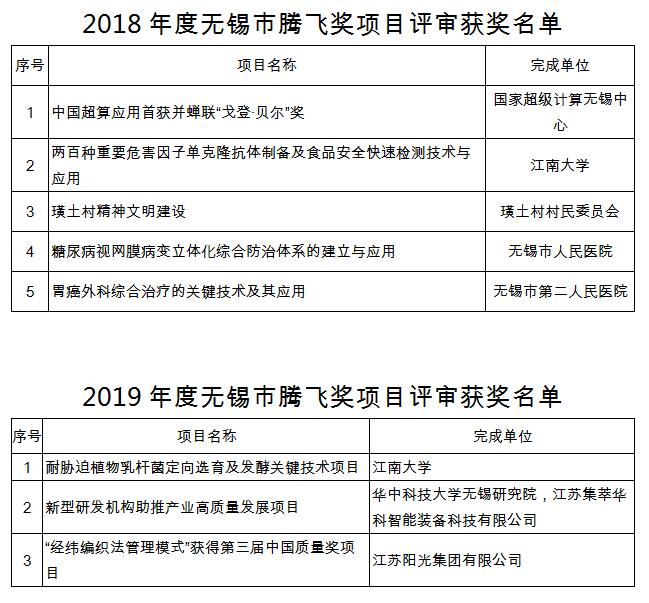 附件:2018 年度、2019 年度無錫市騰飛獎項目評審獲獎名單