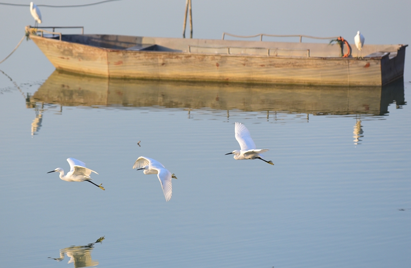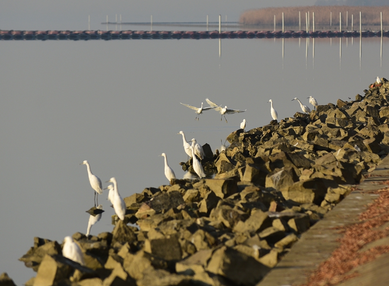 1月14日,鷺鳥在太湖新城太湖飛舞嬉戲。 寒冬時節(jié),成群鷺鳥棲息在無錫太湖邊,成為一道靚麗的風(fēng)景。