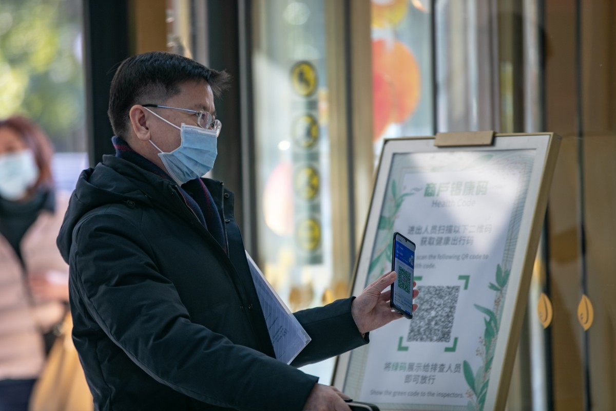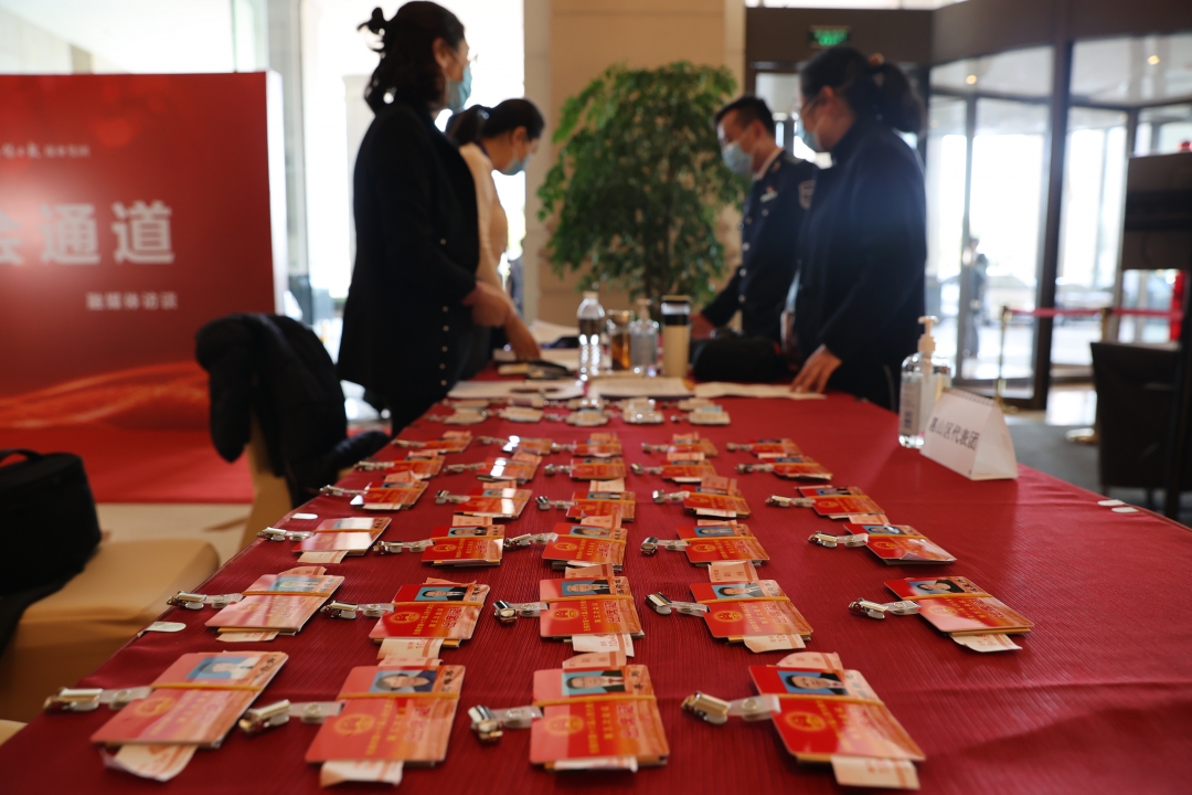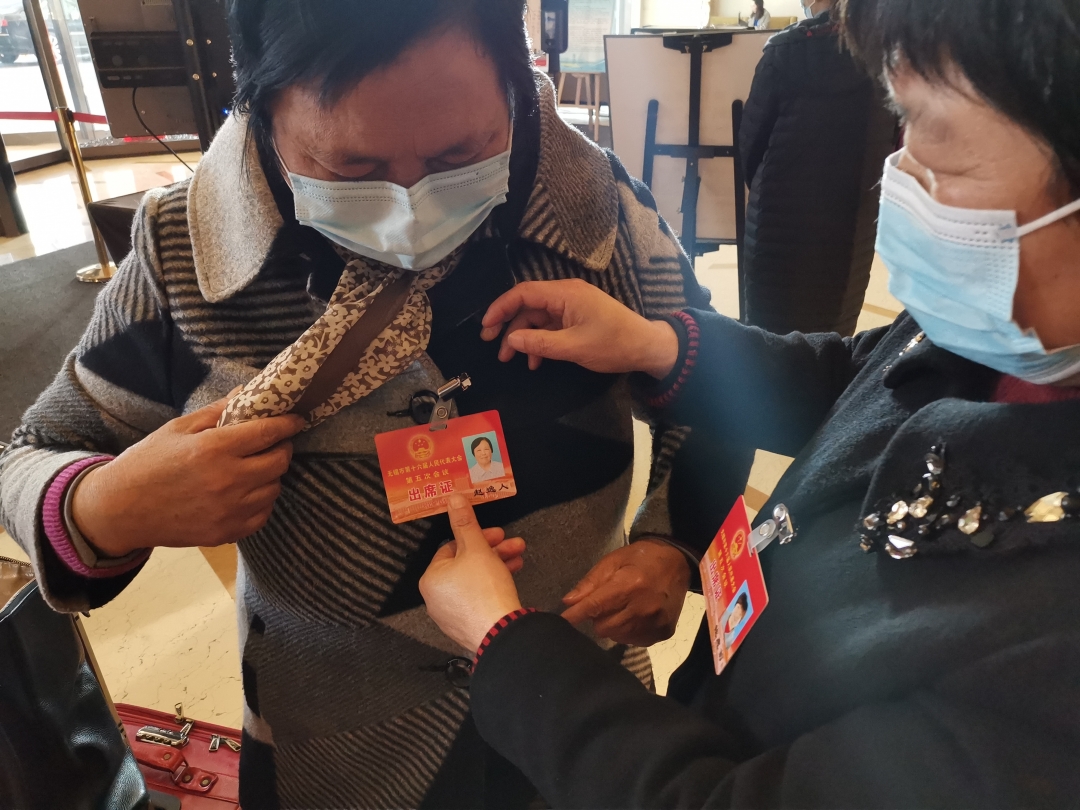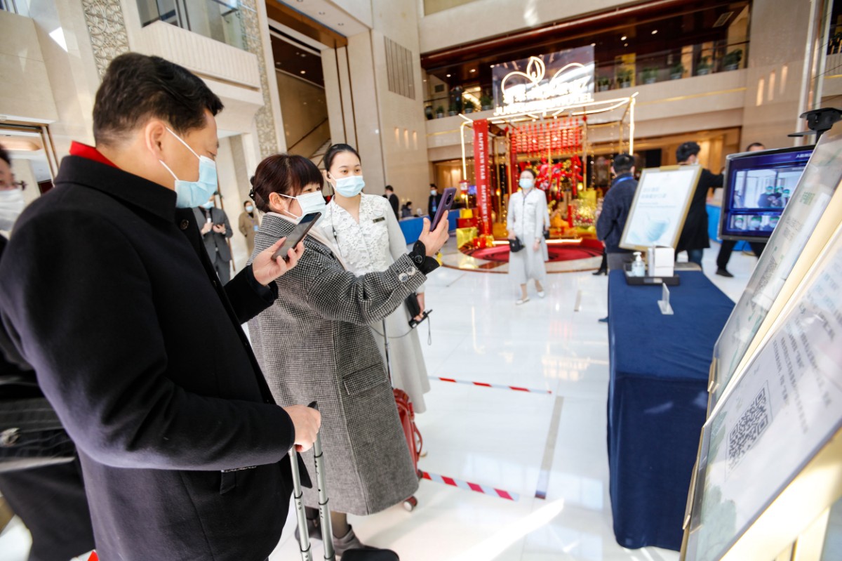 走進駐地,人臉測溫監(jiān)控管理系統(tǒng)迅速測量代表們的體溫,代表們自覺掃碼進入駐地,大廳地面上“2021一路向前”的引路指標(biāo)顯眼奪目。