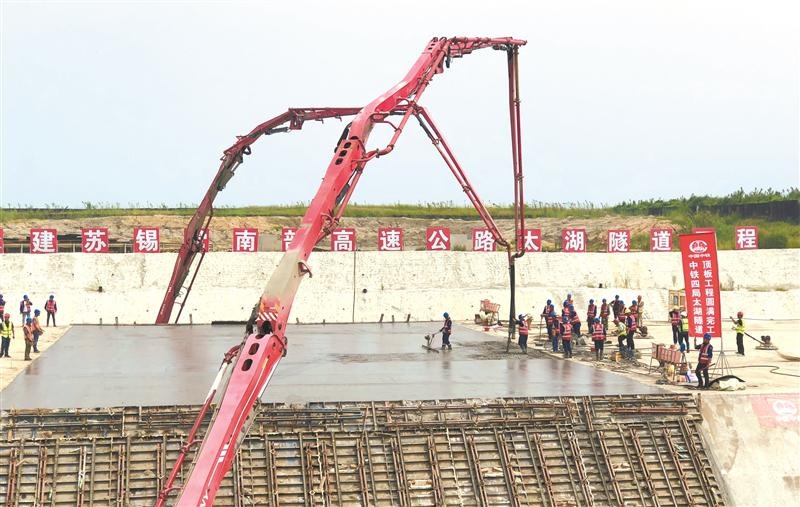 伴隨著28名施工人員和泵車長(zhǎng)達(dá)20個(gè)小時(shí)的連續(xù)作業(yè),澆筑、攤鋪反復(fù)多次,約1750立方米的混凝土澆筑至太湖隧道南泉段第6倉(cāng)頂板上。昨天上午11點(diǎn)左右,最后一方混凝土從罐車澆向作業(yè)面,太湖隧道南泉段主體結(jié)構(gòu)竣工,長(zhǎng)達(dá)10.79公里的湖底隧道實(shí)現(xiàn)南泉段全“閉合”。蘇錫常南部高速公路全線預(yù)計(jì)年內(nèi)可交工投用。