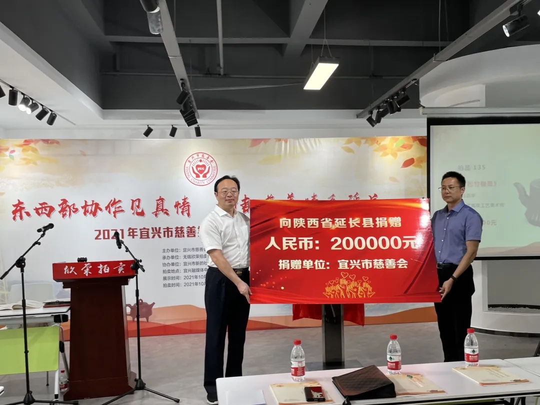 作為紅色老區(qū),延長人民在革命年代為新中國成立作出了巨大貢獻,延長縣是宜興東西部協(xié)作的結(jié)對城市,為開展協(xié)作,加深兄弟情誼,宜興市慈善會在此次拍賣現(xiàn)場,專門成立了“宜興市東西部協(xié)作慈善基金”。該冠名基金將用于延長縣開展扶貧濟困、促進教育文化等事業(yè)發(fā)展,現(xiàn)場進行了捐贈儀式。拍賣結(jié)束后,宜興市慈善會將邀請幾位愛心陶藝家在10月中下旬赴延長縣進行“情暖延長”扶貧結(jié)對活動,以進村入戶、走訪慰問的形式,讓陶都的愛心跨越千里溫暖困難群眾。