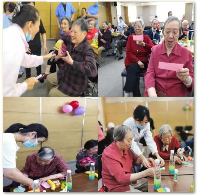 主持人宣布文娛表演開始,一個(gè)個(gè)精彩紛呈的節(jié)目就上演了。開場舞《蘭花草》展現(xiàn)了護(hù)理員和保潔員熱愛生活、熱愛運(yùn)動(dòng)的精神面貌,她們的舞蹈令臺下的老人們仿佛回到了青蔥歲月,激發(fā)了老人們的熱情?! ‰q笾陞s不服老,老人們隨即表演了精彩的節(jié)目。在管理老師和護(hù)理員的帶領(lǐng)下,他們用手語舞《萬疆》和歌曲《紅梅贊》表達(dá)了對祖國的熱愛和對幸福生活的滿足。“你就是我的天使,保護(hù)著我的天使,從此我再也沒有憂傷……”,殘疾人托養(yǎng)中心的折翼天使們在社工的帶領(lǐng)下,組成了一個(gè)“夢想海星”樂隊(duì),他們用甜美的歌聲和節(jié)奏明快的鼓聲給老人們送上節(jié)日的祝福!活動(dòng)中還穿插了“我畫你猜”小游戲和“七彩燈籠”手工制作,讓老人們動(dòng)手又動(dòng)腦,增加活動(dòng)的參與度。就像歌中所唱的“最美不過夕陽紅”一樣,讓老人們在養(yǎng)老院真正過上“老有所養(yǎng),老有所依,老有所樂,老有所安”的幸福晚年生活。