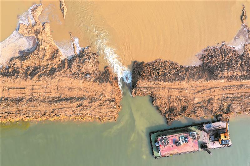 昨天上午8點,太湖隧道南泉段施工現(xiàn)場一片繁忙。隨著挖機揮動鐵臂挖開圍堰,隧道南側(cè)出現(xiàn)了一處入水口,汩汩湖水從太湖流入圍堰內(nèi)。中鐵四局太湖隧道項目部工程部部長何杰紅介紹,本次回水為隧道第7倉至第10倉,回水量約90萬立方米,預(yù)計回水時長約48小時。此次回水后將新增1.5公里的隧道主體處于水面以下,隧道整體“潛入”湖底。
