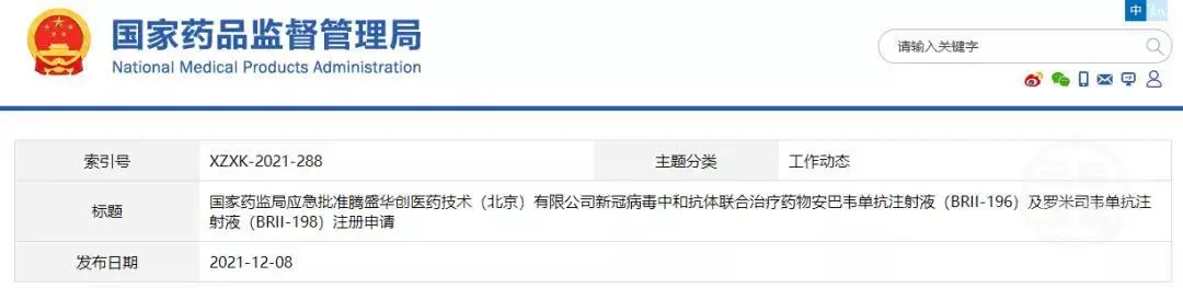 當天,國家藥品監(jiān)督管理局應急批準騰盛華創(chuàng)醫(yī)藥技術(北京)有限公司新冠病毒中和抗體聯(lián)合治療藥物安巴韋單抗注射液(BRII-196)及羅米司韋單抗注射液(BRII-198)注冊申請,這是我國首個獲批的自主知識產權新冠病毒中和抗體聯(lián)合治療藥物。