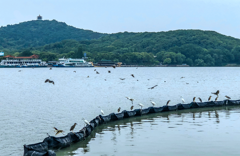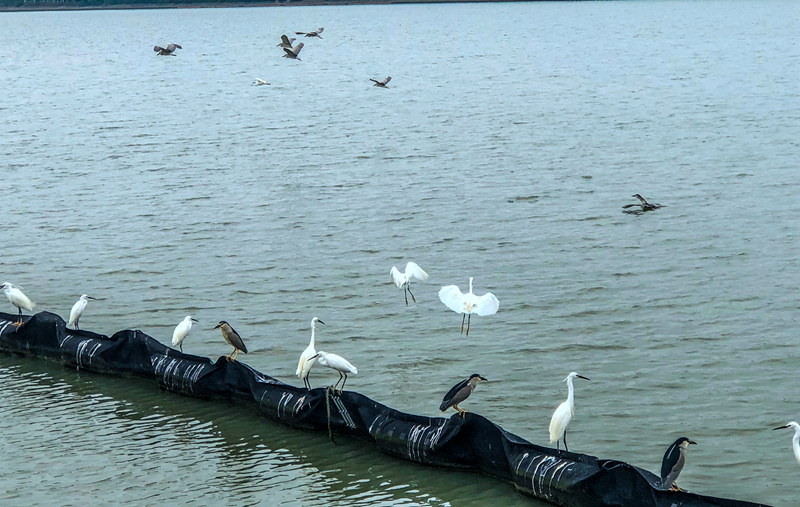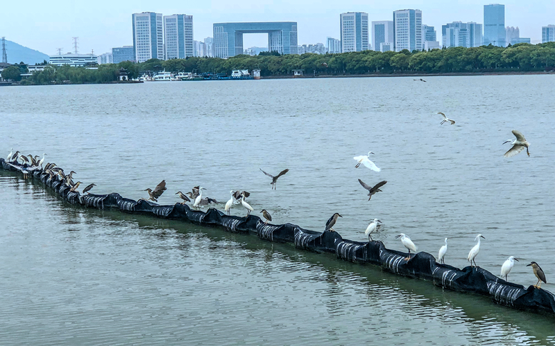 5月15日,大批的鷺鳥在管社山前的梅梁湖水面上嬉戲、停留。隨著水生態(tài)環(huán)境的持續(xù)改善,太湖水域已成為灰鷺和白鷺等對水環(huán)境要求較高的水鳥的固定棲息地,鳥類種群數(shù)量不斷增加,因而出現(xiàn)了難得一見的“千鷺聚太湖”的奇觀。