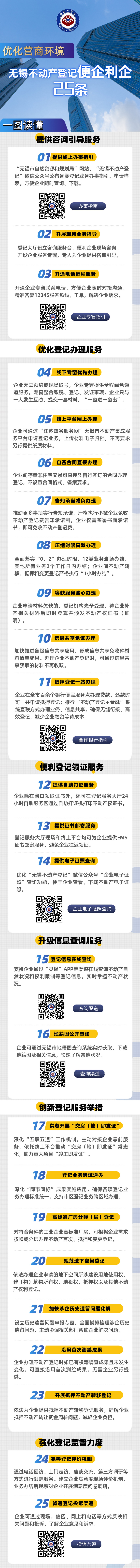 為更好優(yōu)化營商環(huán)境,不斷提升不動產登記服務效能,為企業(yè)復工復產、推動實體經濟發(fā)展增添助力,無錫出臺不動產登記便企利企25條,涉及咨詢引導、登記辦理、便利領證、信息查詢、創(chuàng)新服務、監(jiān)督投訴等6大方面,圍繞“減材料、減成本、減時間、減環(huán)節(jié)”,打造保姆式、一站式貼心服務,全力助企紓困解難。(市不動產登記中心)