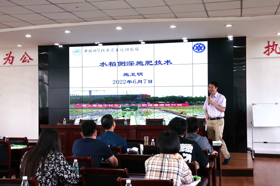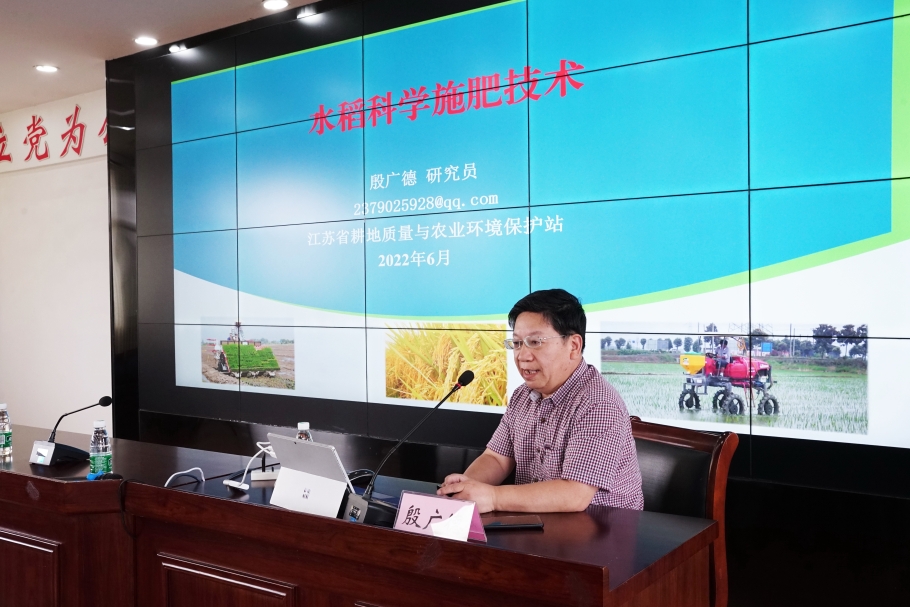 培訓(xùn)會(huì)上,江蘇省耕地質(zhì)量與農(nóng)業(yè)環(huán)境保護(hù)站殷廣德研究員、中國(guó)科學(xué)院南京土壤研究所施衛(wèi)明研究員兩位專家分別就測(cè)土配方施肥技術(shù)、水稻側(cè)深施肥技術(shù)進(jìn)行了授課。