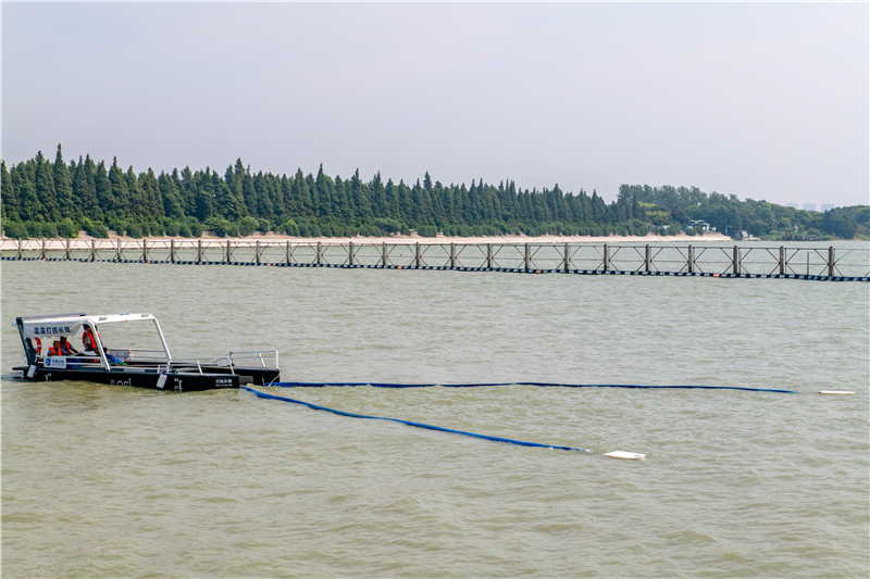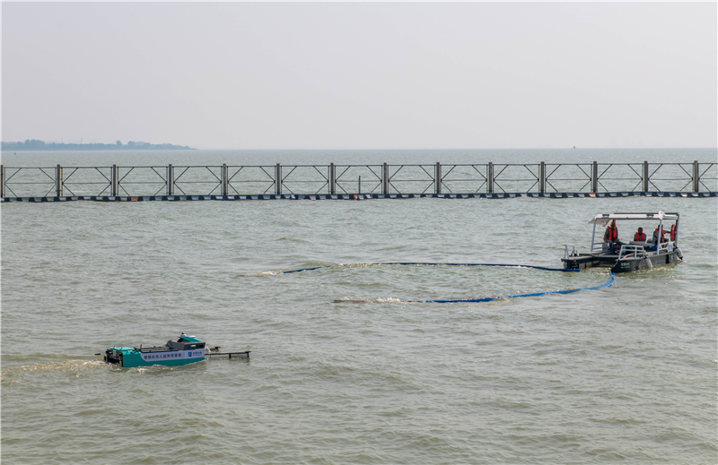 26日,記者來(lái)到南泉水源廠,走上棧橋,只見(jiàn)岸邊近10臺(tái)推流器開(kāi)足馬力卷起浪花,防止藻類沿岸聚集。遠(yuǎn)眺湖心取水口,多臺(tái)水上“神器”正在湖面忙碌著。智慧打撈船兩只長(zhǎng)臂好似龍蝦觸角,長(zhǎng)臂頂端裝有微型牽引機(jī)器人控制開(kāi)合,行船時(shí)可一邊抽吸湖水一邊過(guò)濾水中的藻類顆粒,相比人工拉網(wǎng)清藻效率提升數(shù)倍。無(wú)人監(jiān)測(cè)預(yù)警船如同水上的“掃地機(jī)器人”,預(yù)設(shè)好路線就可自動(dòng)巡航監(jiān)測(cè)水質(zhì),24小時(shí)待命,電量不足時(shí)自動(dòng)返回充電。