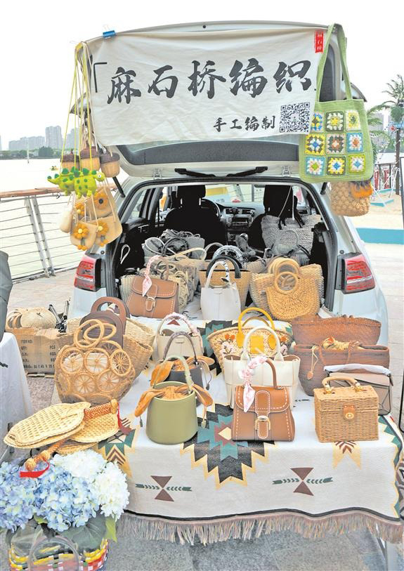 “想著做點(diǎn)什么,補(bǔ)貼一點(diǎn)家里”,艷艷在2020年疫情發(fā)生之后就開(kāi)始了第一次擺攤,最初是在步行街租了一個(gè)固定的攤位,今年看到有朋友做起了后備廂擺攤,她觀望了一陣子覺(jué)得很有意思,也加入了進(jìn)來(lái)。“最大的好處是沒(méi)什么成本,只要一輛車(chē),有一點(diǎn)自己的貨源就能做起來(lái)。”后備廂前支一張桌子,把編織包和皮包分門(mén)別類(lèi)放好,再把織有俏皮圖案的童趣包單獨(dú)拿出來(lái)掛在車(chē)子兩邊,短短20分鐘,一箱子包包在艷艷熟門(mén)熟路的布置下,變得錯(cuò)落有致起來(lái)。擺放的過(guò)程中,不時(shí)有路人上前試背。攤位上,除了擺有收款碼,艷艷還貼出了自己的微信二維碼,不少客戶(hù)從線下轉(zhuǎn)到了線上,從過(guò)路客變成了朋友圈里人。“在公司上班比較乏味,下了班到這里看看湖光水色和嬉笑人群,是一件很解壓的事,在這過(guò)程中也能認(rèn)識(shí)很多朋友”,艷艷很享受這份舒心愜意。抱著這樣的心態(tài),再熱的天出攤,她也不覺(jué)得辛苦。