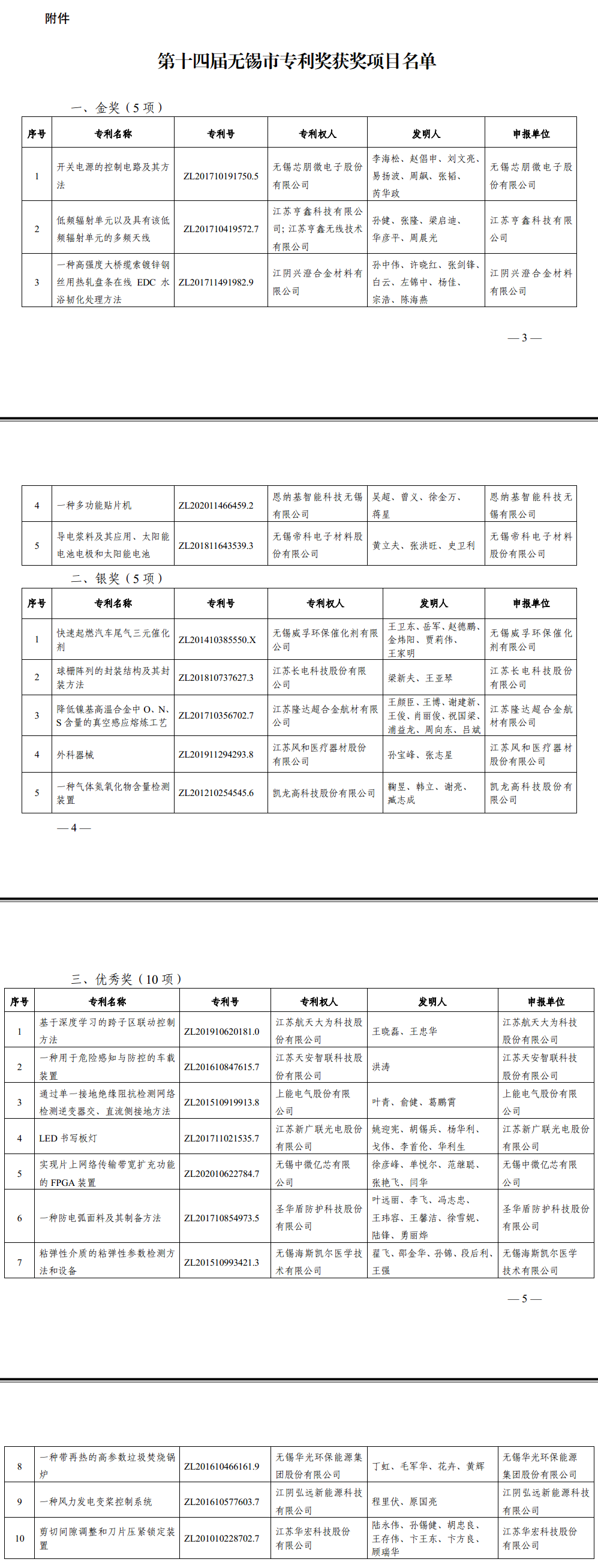 附件:第十四屆無錫市專利獎獲獎項目名單