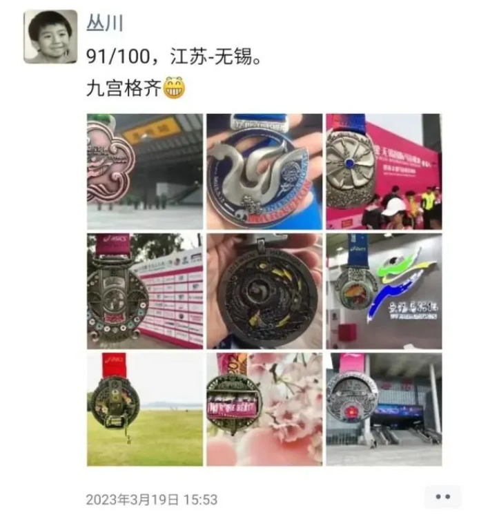 拿到2023無錫馬拉松的獎(jiǎng)牌之后,叢川提著它拍了一張照片,發(fā)了個(gè)朋友圈:“九宮格齊”。