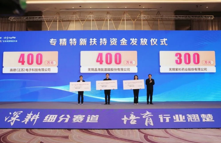 近日,在錫山區(qū)“專精特新”企業(yè)發(fā)展推進(jìn)大會(huì)上,錫山區(qū)的高德(江蘇)電子科技股份有限公司、無(wú)錫晶海氨基酸股份有限公司、無(wú)錫紫杉藥業(yè)股份有限公司3家企業(yè)領(lǐng)到了省級(jí)“專精特新”扶持資金累計(jì)約1100萬(wàn)元。