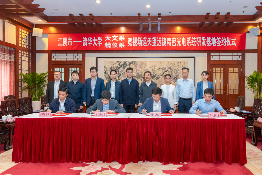 5月7日,江陰市與清華大學天文系、精儀系舉行“寬視場巡天望遠鏡精密光電系統(tǒng)研發(fā)基地”簽約儀式。清華大學黨委副書記過勇,無錫市委常委、江陰市委書記許峰,清華大學無錫應用技術研究院院長鄭永平,清華大學國內(nèi)合作辦主任牛犇,清華大學天文系副系主任蔡崢,精儀系主任助理黃磊,清華大學團委副書記于朔,無錫市科技局副局長侯海峰,江陰市領導吳莉萍、陳涵杰、曹興華、祁軍,清控科創(chuàng)總裁程方,江陰(北京)創(chuàng)新中心總經(jīng)理祝麗萍,副總經(jīng)理劉志強等出席簽約儀式。