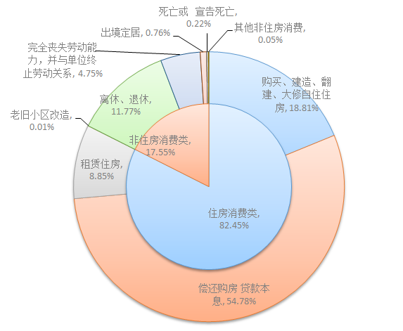 2023年二季度,住房消費(fèi)類提取金額為50.67億元,環(huán)比增長4.69%,占二季度提取額的82.45%。其中,購房購買、建造、翻建、大修自住住房和還貸提取占重要位置,提取金額分別11.56億元、33.67億元,占二季度提取額的18.81%、54.78%。具體提取結(jié)構(gòu)如下: