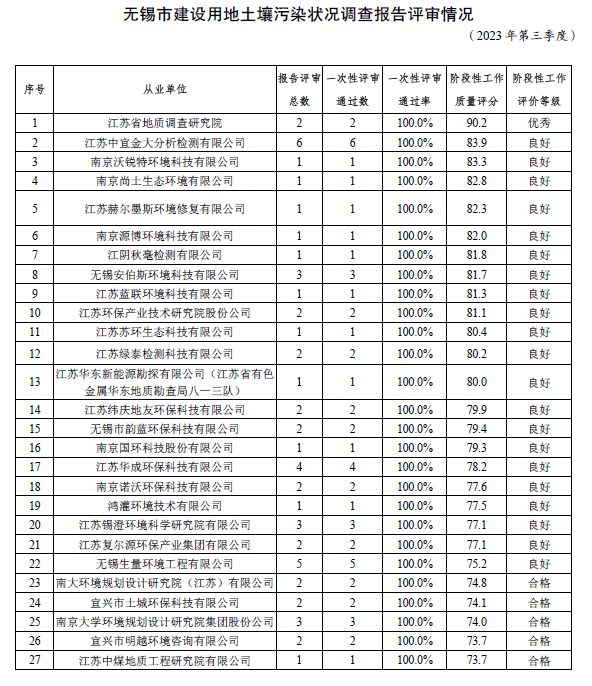 根據(jù)《無錫市建設(shè)用地土壤污染狀況調(diào)查從業(yè)單位工作質(zhì)量評價辦法(試行)》,我局對全市2023年第三季度建設(shè)用地土壤污染狀況調(diào)查報告評審情況進(jìn)行了匯總,相關(guān)情況公示如下: