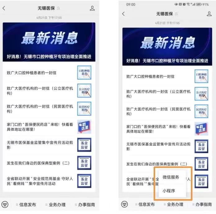 第一步:關(guān)注“無錫醫(yī)保”微信公眾號,點(diǎn)擊“業(yè)務(wù)辦理”,選擇“微信服務(wù)”,實(shí)名注冊賬戶后登錄;