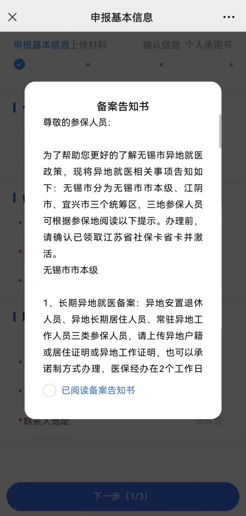 第三步:填寫備案信息和聯(lián)系人信息。進(jìn)入此步驟后的操作,與無錫微信公眾號辦理相同,請參閱無錫醫(yī)保微信公眾號辦理異地就醫(yī)之第六、第七、第八步。