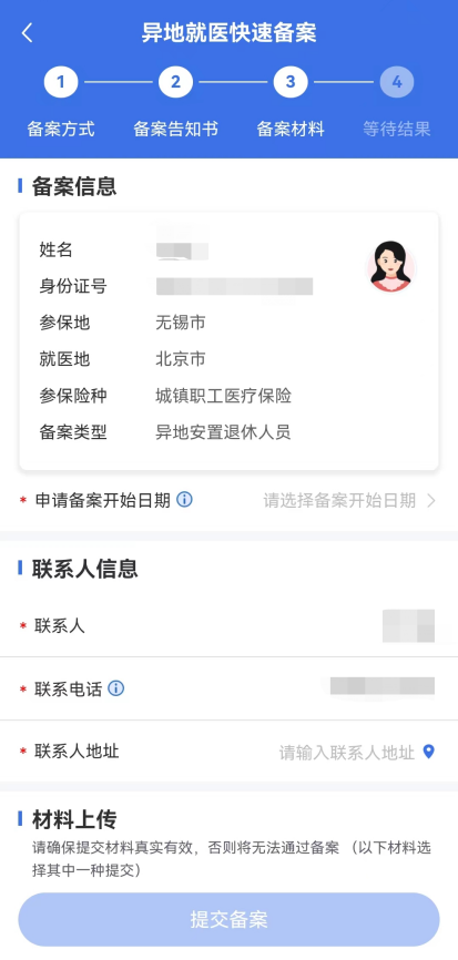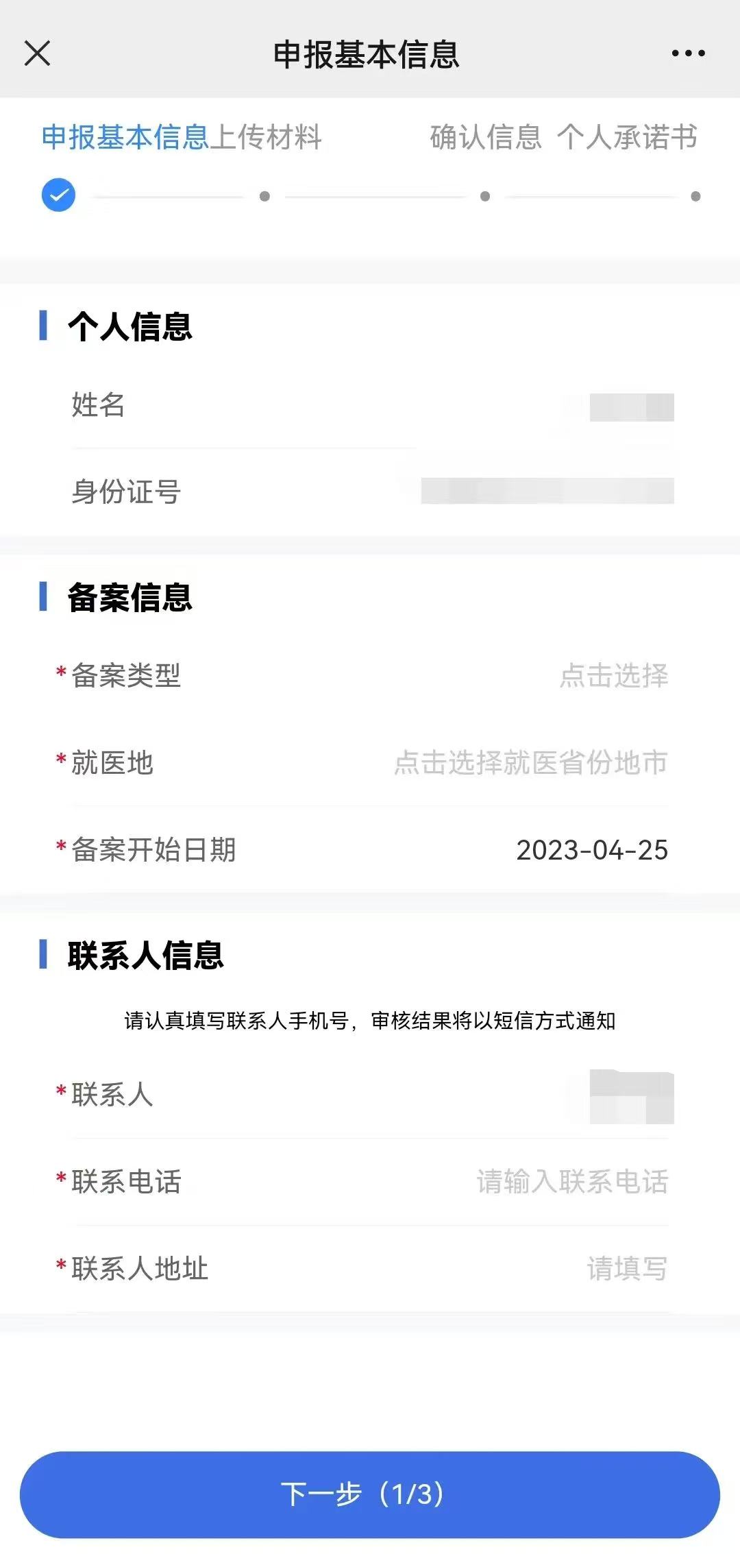 第五步:填寫備案信息和聯(lián)系人信息(選擇承諾制備案的,聯(lián)系人地址要填寫就醫(yī)地詳細(xì)聯(lián)系地址,如:xx市xx區(qū)xx街道xx小區(qū)xx幢xx室),帶*為必填項(xiàng)。