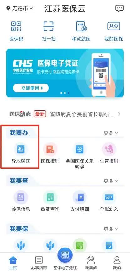 第一步:下載“江蘇醫(yī)保云”APP,點(diǎn)擊首頁“我要辦”板塊的“異地就醫(yī)”模塊。
