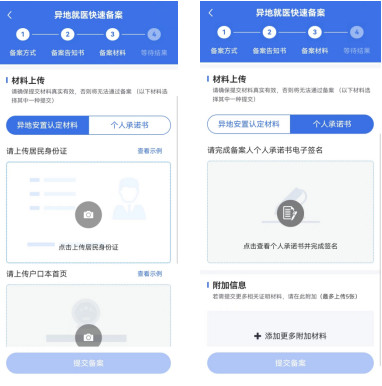 *選擇“異地轉(zhuǎn)診人員備案”必須上傳材料,不能選擇個(gè)人承諾書。