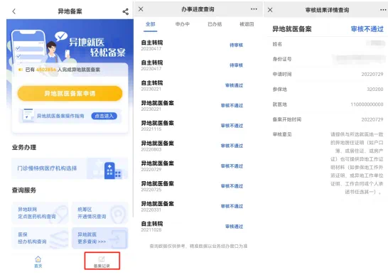 提交備案申請后,可返回“異地備案”板塊,點(diǎn)擊“備案記錄”,顯示“審核通過”即辦理成功,顯示“審核不通過”可點(diǎn)擊查看不通過原因。