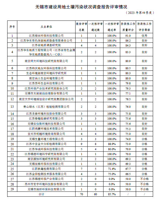 根據(jù)《無錫市建設(shè)用地土壤污染狀況調(diào)查從業(yè)單位工作質(zhì)量評價辦法(試行)》,我局對全市2023年第四季度建設(shè)用地土壤污染狀況調(diào)查報告評審情況進行了匯總,相關(guān)情況公示如下: