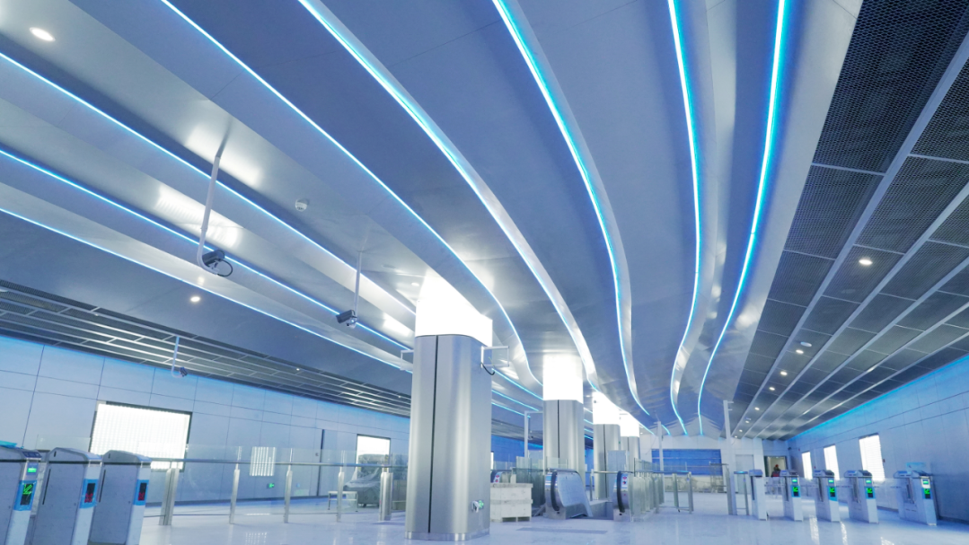 江陰外灘站作為S1線起始站,位于春申路與韭菜港路交叉口處,為地下二層島式車站。車站有效站臺長度120米,是S1線體量最大的站點,相當于3個標準站的大小。車站吊頂通過模擬江潮迭起的形態(tài),展現(xiàn)出律動柔美的曲線,沿天花板造型鋪設的暗藏燈光不僅滿足了照明的實用功能,而且營造出時尚運動的活力氛圍。