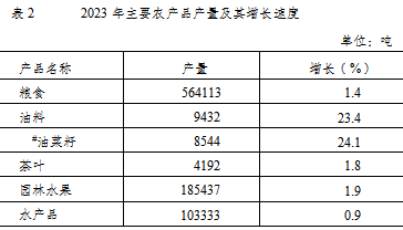 全年糧食總產(chǎn)量56.41萬噸,比上年增長1.4%。油料總產(chǎn)量9432噸,比上年增長23.4%,其中油菜籽8544噸,比上年增長24.1%。茶葉總產(chǎn)量4192噸,比上年增長1.8%;園林水果總產(chǎn)量18.54萬噸,比上年增長1.9%。