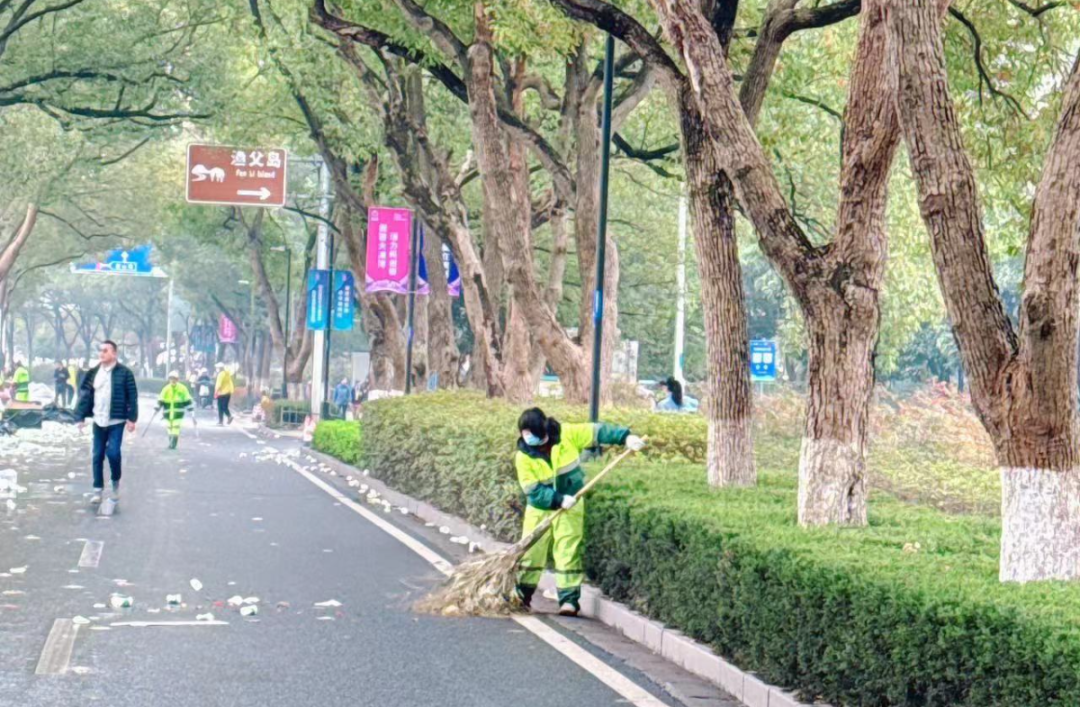 環(huán)衛(wèi)部門實(shí)行“人工駐點(diǎn)巡回保潔、機(jī)械設(shè)備待命跟進(jìn)”的工作機(jī)制,根據(jù)比賽情況開啟波浪式工作模式,環(huán)衛(wèi)工人清理賽道、垃圾收運(yùn)車按順序清理沿途垃圾、洗掃車輛沖洗賽道,在參賽人員過境后迅速對(duì)各點(diǎn)位進(jìn)行保潔作業(yè),確保人清場(chǎng)凈。