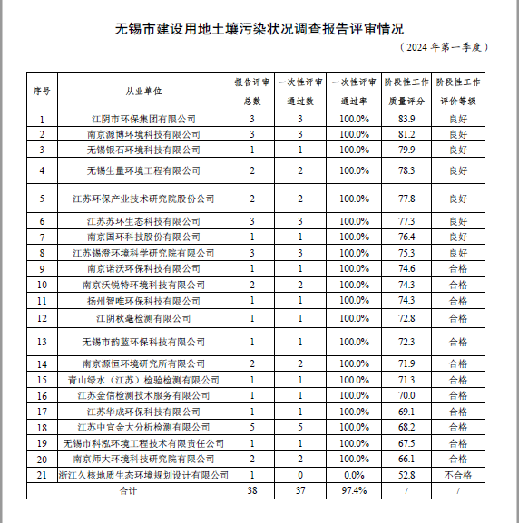 根據(jù)《無錫市建設(shè)用地土壤污染狀況調(diào)查從業(yè)單位工作質(zhì)量評價辦法(試行)》,我局對全市2024年第一季度建設(shè)用地土壤污染狀況調(diào)查報告評審情況進行了匯總,相關(guān)情況公示如下: