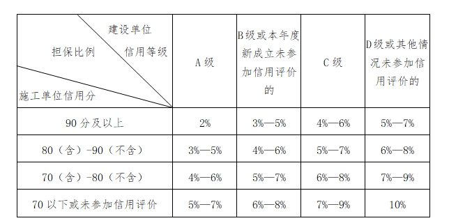 (三)其他項目工程款支付擔保根據(jù)施工單位信用情況采用分級管理制度,具體擔保比例由建設單位和施工單位按照下表范圍在承包合