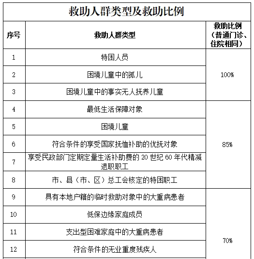 醫(yī)療救助對象根據(jù)認(rèn)定的救助人群類型享受不同的救助比例,具體救助人群類型及救助比例見下表。