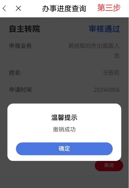異地就醫(yī)備案成功后,點(diǎn)擊首頁(yè)【我要查】-【辦事進(jìn)度查詢】模塊,在【辦事進(jìn)度查詢】中選擇已審核通過的需要撤銷的備案信息,點(diǎn)擊【撤銷】,彈出撤銷成功即可。