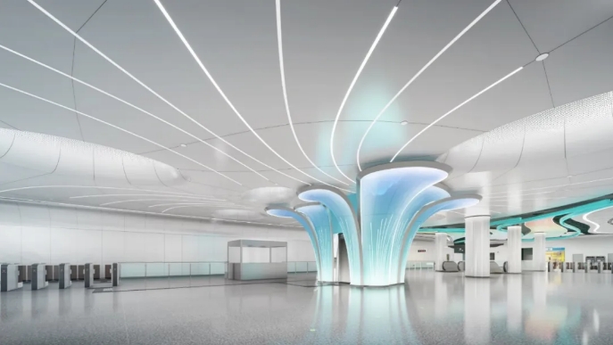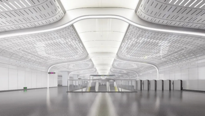 地鐵4號(hào)線二期無錫新區(qū)站,首次采用的大空間無柱設(shè)計(jì)是車站裝飾裝修最明顯的標(biāo)志。
