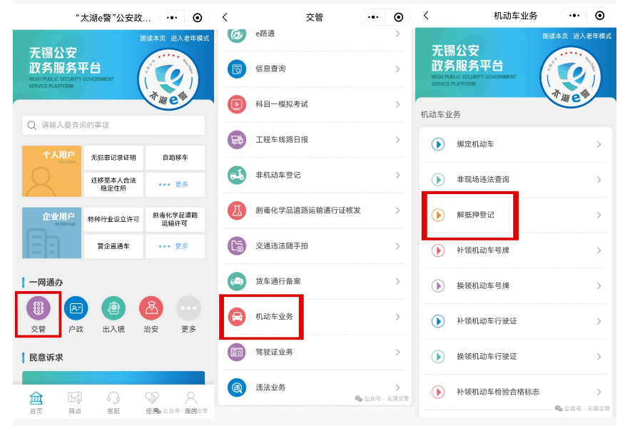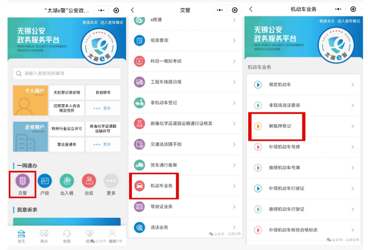 微信搜索 “太湖e警” 小程序,點擊交管-機動車業(yè)務-解抵押登記-解抵押業(yè)務辦理菜單。