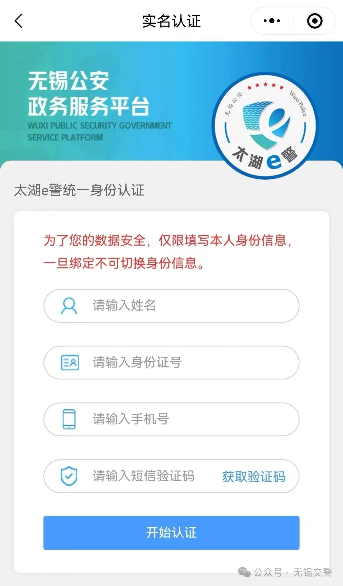 如果您的微信賬號未在 “太湖e警” 小程序中實名認證過,需要先完成實名認證操作。