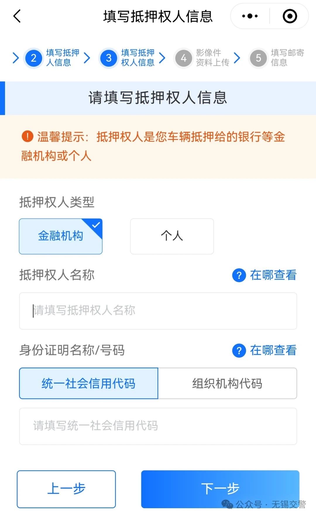 抵押權人是車輛抵押給的銀行等金融機構或個人,統(tǒng)一社會信用代碼可以參照示例圖填寫。