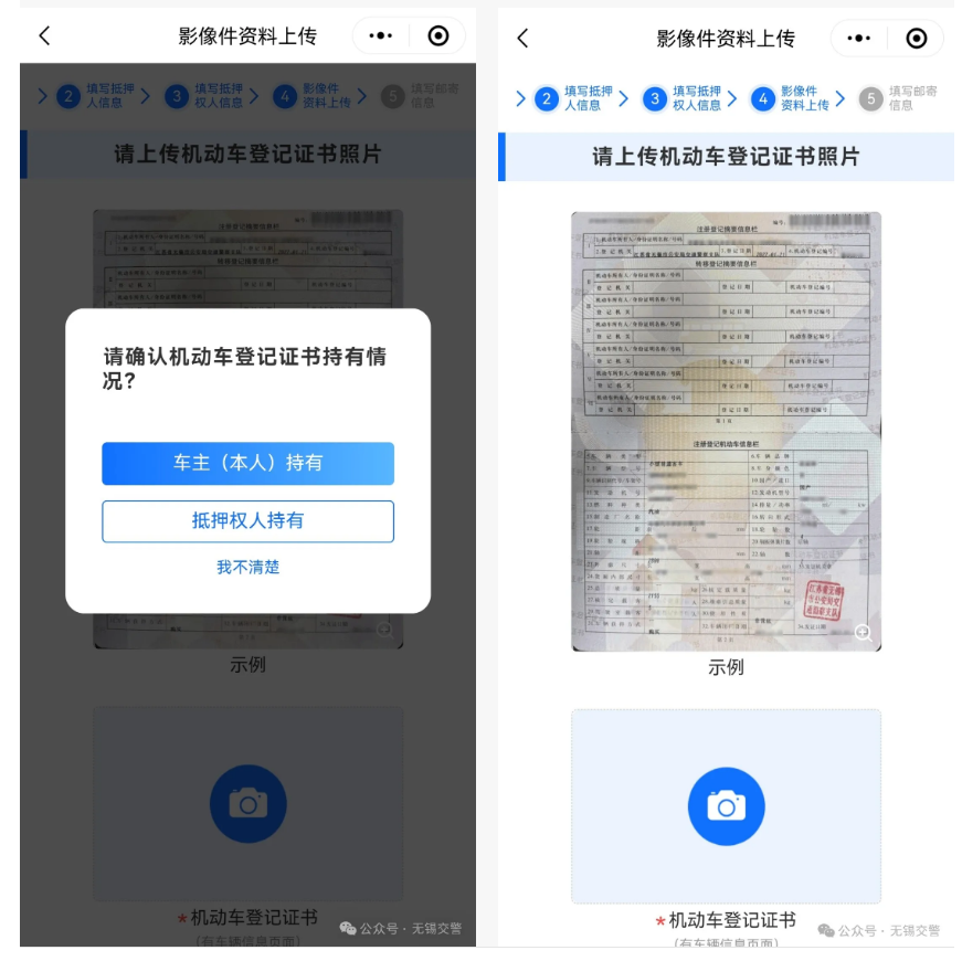 ?。?)上傳登記證書照片。如實選擇登記證書當前的持有情況,如果現(xiàn)在在車主手里,則選擇車本(本人)持有,則需要上傳登記證書照片;如果現(xiàn)在在抵押權人手里,選擇抵押權人持有,則跳過該步驟。