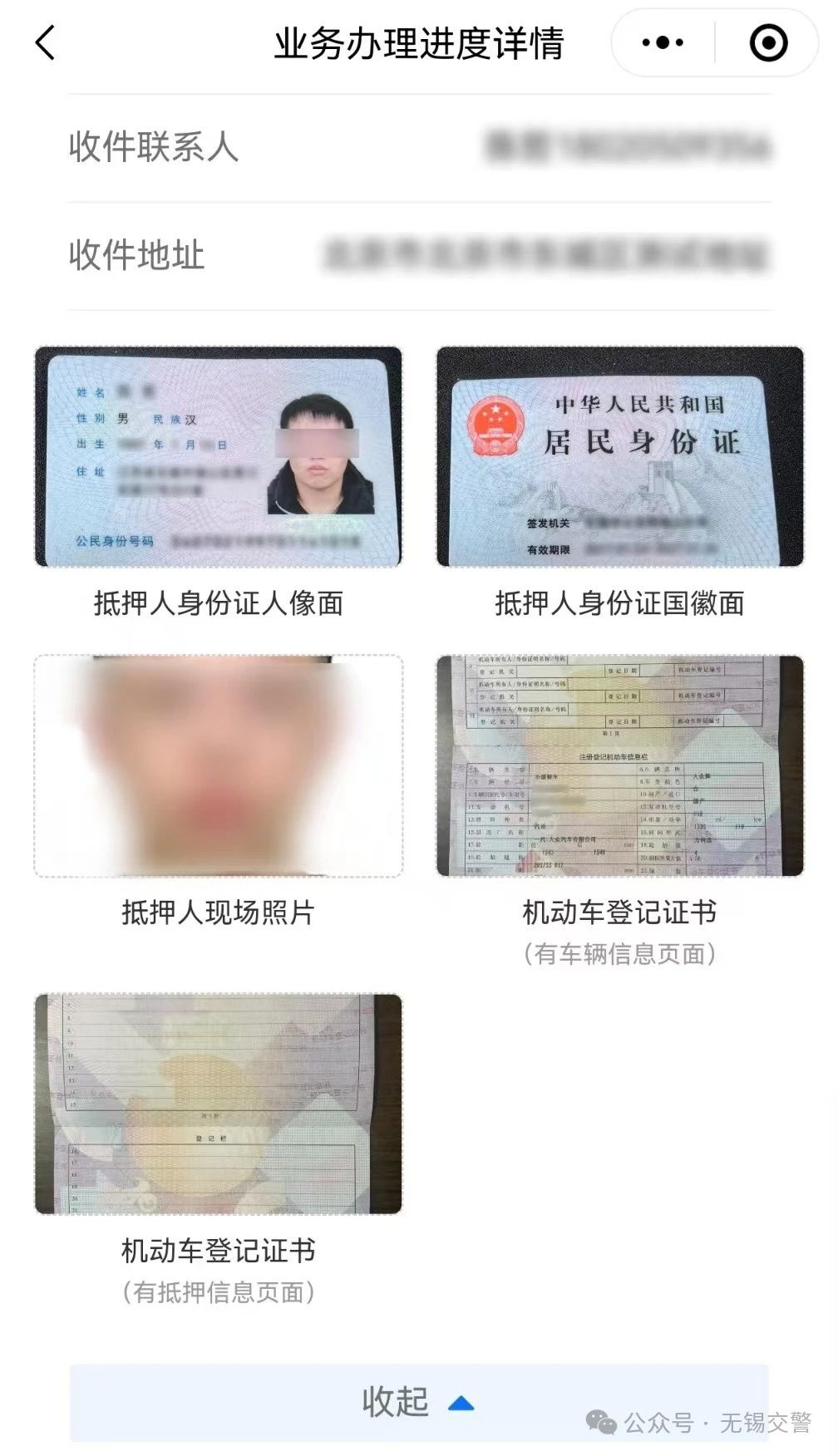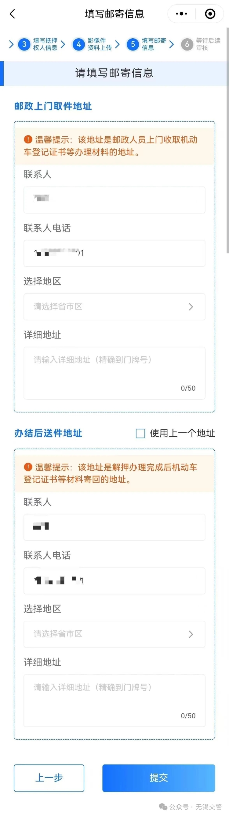 郵政上門取件地址:郵政人員上門收取機動車登記證書等辦理材料的地址。